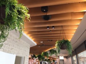駅ビル全体を通じて、植物や木の素材が天井や壁を包んでいて、緑が多くて落ち着く感じです。
