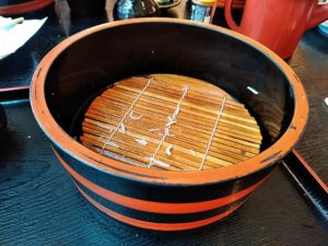 待つことしばらくして届けられたのが、桶のような器に盛られたそばです。
